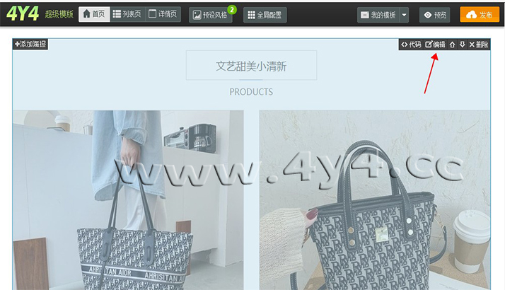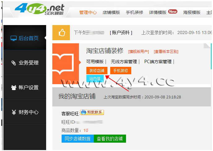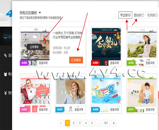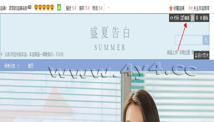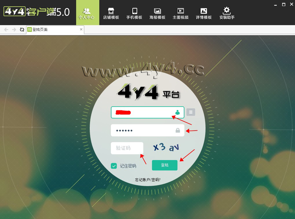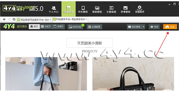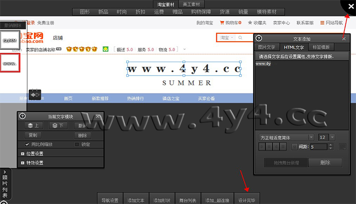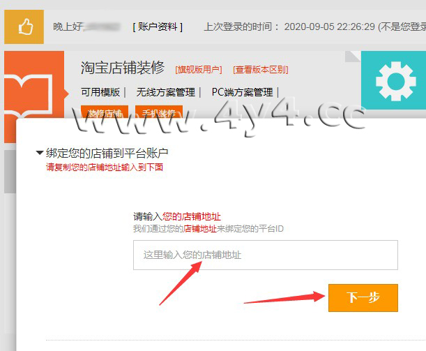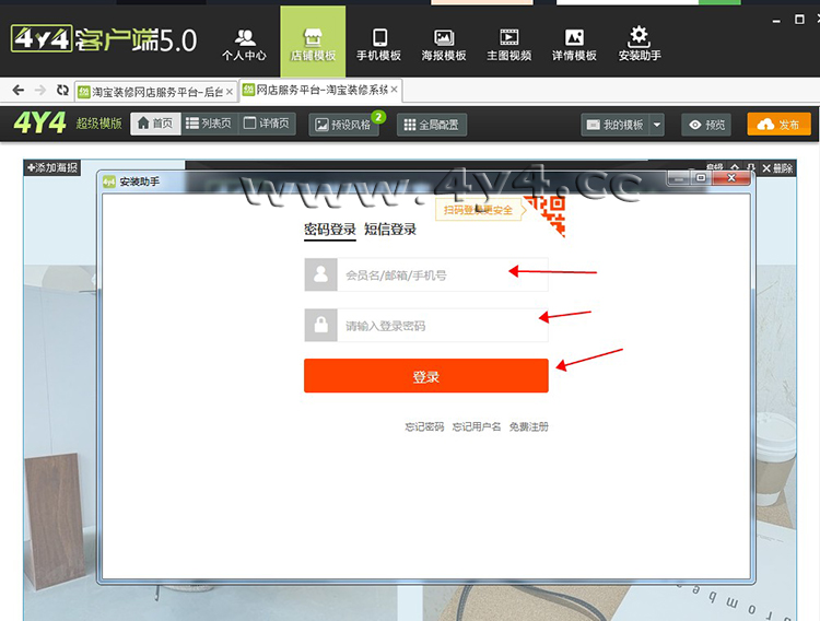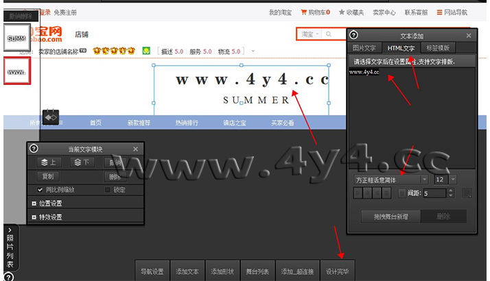 虽然4y4模板操作比较简单,但对于新手小白用户来说,还是有一定的难度,看我们官方的视频教程也未必学会,那么您只需要根据我们写的步骤进行设置就可以完成装修了,几乎每一步都有截图标注,不用担心看不懂1、下载安装客户端点击下载: http://www.4y4.cc/4y4vip/下载之后,安装的步骤很简单了,按照提 示,点击下一步就可以了。安装完成之后,在桌面上有4y4客户端的图标,双击 就可以启动。 2、登录4y4模板帐号、绑定店铺地址打开之后5.0新版4y4客户端,会员中心,输入账号和密码,登录 绑定之后,会自动同步店铺数据一次,新手用户点击一次 【同步店铺数据】,以后登录客户端,每次都先去点击这个,目的是将店铺的数据,同步到 4y4模板平台。 4、应用模板①如果是购买的一套模板,点击下图所示:【可用模板】5模板编辑新手用户只需要修改两个地方,就可以了,第一个是店招上面的文字, 改为店铺名称。第二个是产品模块上,选择上需要展示的产品。 弹出的界面中,点击【开始制作图片店招】 进入店招 编辑页面,单击需要修改的文字,右侧会出现编辑框,可以修改文字,文字的位 置可以拖动,注意中文字体与英文字体的切换。修改完成后,点击下方的【设计 完毕】 点击【设计完毕】并不会退出这一步,需要点击右上角的叉号,关闭编辑 器 选择产品产品模块,鼠标移动到上面,点击编辑, |