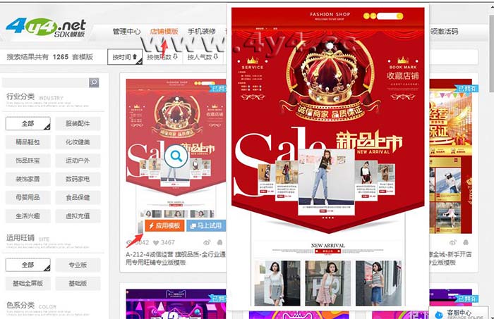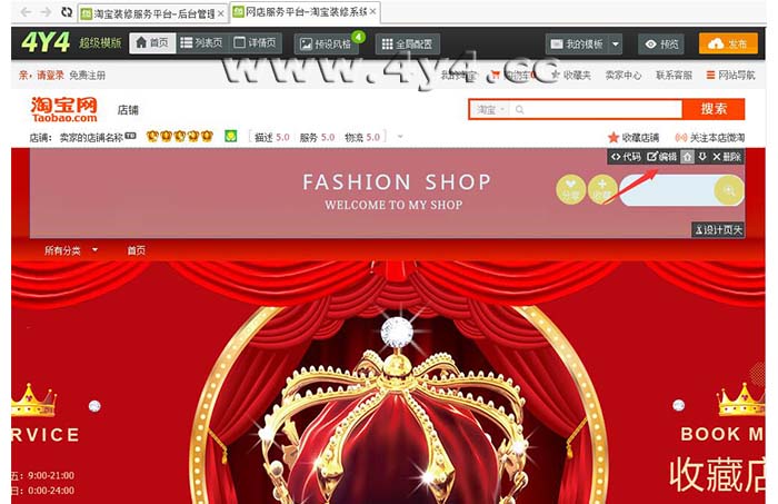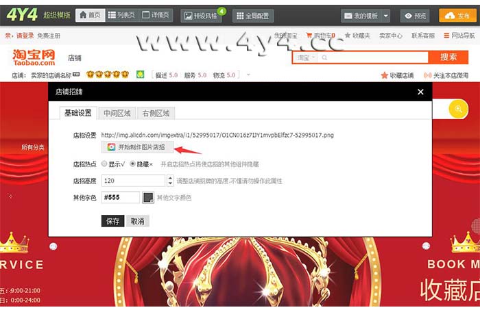 4y4模板装修平台官网操作视频教程淘宝店铺招牌(店招)设计,店招:就是店铺招牌,页面上第一个模块,每个店铺页面上都会显示,店招要担负三个职责,店铺宣传、促销信息、格调 好的店招既能“传情达意”,又让客户“赏心悦目”。 店铺招牌就是显示在网店最上面的横幅,它通常也会显示在每个商品页面的最上面,是传达店铺信息、展示店铺形象的最重要部分。如果招牌设置合理。既能“传情达意”,又让客户“赏心悦目”,就会给客户留下美好的第一印象,才有可能让客户继续停留在网店里浏览、选择商品。反之,可能会给客户不专业的感觉,从而会降低客户对店铺和商品的信任度,结果导致客户不敢轻易下单。因此店铺招牌要真正发挥招揽顾客的作用,在设置时需要遵循“明了、美观、统一”原则。明了就是要把主营商品用文字、图像明确地告知给顾客,而不是过于含蓄或故弄玄虚:美观主要指图片、色彩、文字的搭配要合理,要符合大众审美观:统一就是招牌要与整个网店的风格一致。 1.首先选择一个4y4店铺模板,点应用模板 2.应用模板后,进入装修页面,点编辑店招 3.点编辑后,会出现开始制作按钮,再点开始制作图片店招 4.进入店铺编辑修改页面,点击上面的文字,右边上,输入你自己的店铺名,然后点设计完毕,再点右上方的X,即可 5.下面是4y4模板店铺招牌店招设计操作视频教程 6.以上是4y4装修平台,店铺招牌制作设计教程,如有不懂的朋友,可直接联系我们官方客服旺旺:feng18868 |