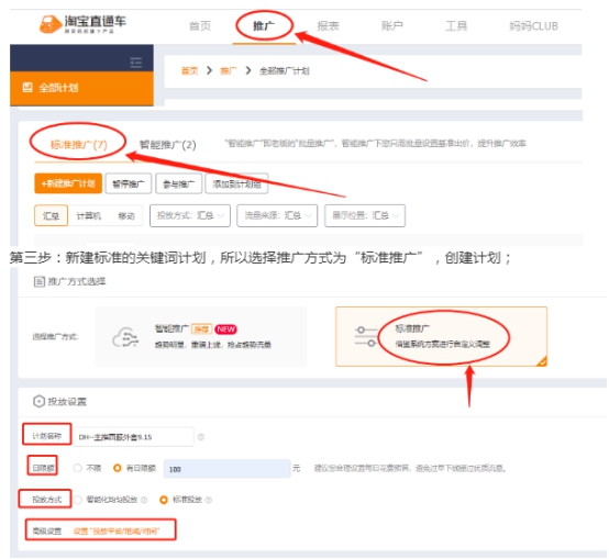 | 在日常店铺运营过程中,直通车是可以最快速的帮助店铺提升流量的推广工具,对于很多新手卖家来说,不知道如何来创建一个标准的直通车计划,搞得的杂乱无章,那么直通车计划到底应该如何新建呢,今天给大家详细说明一下~ 第一步:首先在卖家中心后台--营销中心--我要推广,找到直通车的入口,点击进入; 第二步:在直通车后台,进入到推广页面;下滑找到”新建推广计划”,点击“新建推广计划”就进入到了计划创建的页面; 第三步:新建标准的关键词计划,所以选择推广方式为“标准推广”,创建计划; 1. 计划名称:建议大家在创建计划的时候,计划名称标注好计划里所推的款以及计划创建的时间,例:主推/辅推/测款+宝贝关键词+创建日期; 2. 日限额:大家可以根据自己的预算设定限额,前期可以投入少一些,后期根据数据的反馈情况在针对限额调整; 3. 投放方式:大家可以根据自己的实际情况来进行选择,我个人的习惯是用”标准投放“,前期大家自己创建计划的话,可以使用智能化均匀投放,可以使计划全天性投放; 智能化均匀投放:优选高质量流量进行展现,延长推广宝贝的在线时长,提升宝贝转化效果 标准投放:根据您的投放设置的出现展现您的推广 4. 高级设置:主要是对投放平台,投放地域,投放时间来进行设置 首先说一下投放平台,分为PC端、无线端,又分为站内和站外推广,我们可以根据计划的推广目的去做投放平台设置,除了PC端的站内流量是默认投放的以外,其他端口都是可以自行调整的,如果说我们只要站内流量,那站外端口就要关闭,如果我们想站内站外都拿,可以把PC和无线站内站外流量打开,但是在正常情况下,站外的流量转化率是远远低于站内流量的,所以一般情况下只开站内引流端口; 其次来说一下地域的设置,还是根据大家自身的情况来调整设置,一般情况下不投放的地区就是国外、港澳台以及偏远地区,特殊需要注意的就是也可以屏蔽同行多的地区,避免恶意竞争; 最后就是时间折扣的设置,我们可以根据分析店铺每个时间段的转化走势去设置,转化高得时间段可以重点提高时间折扣进行推广,转化低的时间段可以选择降低时间折扣或是不投放,比如我们的产品在上午9-22点的转化数据比较好,那我们就可以在9-22点进行高折扣设置,时间折扣最高可以设置在250%,凌晨的时间转化不好,我们就可以适当降低折扣;如上图所示,加入我的关键词出价是1元,那么我在9-22点100%的时间折扣下的出价就是1元,而凌晨设置的30%的折扣,那么在凌晨的出价就是1*30%=0.3元; 第四步:点击添加宝贝,找到需要推广的宝贝; 添加完成后,点击下一步,设置推广方案; 在设置推广方案里,可以为宝贝筛选合适的关键词,可以根据相关性,转化率等维度进行筛选,也可以后期在计划中再次进行添加; 智能出价设置的时候需要注意宝贝的推广目标是什么,分别是:促进收藏加购、促进点击、促进成交,一般新品会以点击为主; 这里会有推荐的人群,也可以针对产品情况添加更多精选人群;一般情况下都是以店铺定向人群以及基础属性人群为主加入测试; 第五步:添加创意 每个宝贝可以添加4个创意,可以利用创意来测试点击率更好的标题以及图片,在测图的过程中记得设置流量分配为轮播,测图结束后可以把创意改成优选状态,如下图: 这样我们的标准计划就创建完成了!!过程看起来虽然比较简单,但是在选词,人群以及创意的优化上,需要大家用心去做哦 |