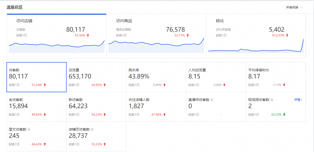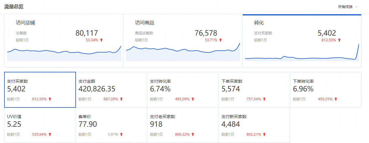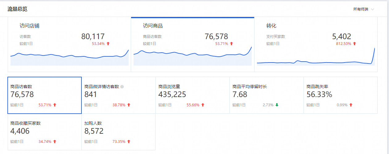主要是从流量总览那里看店铺KPI完成情况,销售额、销售件数、客单价、PV、转化率等数据情况,是否达到预期的目标,同比去年同等级情况如何? 环比上一个大促增长情况是怎么样的?对比的同时尽量对比同等级的大促活动,比如说A+级、S级或者S+级,这样我们就可以有效地看出店铺处于增长还是下滑的状态。 商品 活动商品售罄情况,爆款商品情况。
